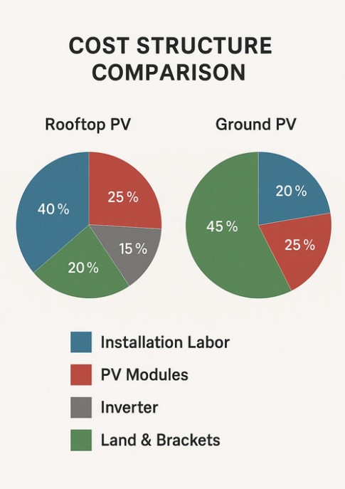 Die Kosten sind ein wichtiger Faktor beim Vergleich dieser beiden Systeme. Dach -PV -Systeme haben im Allgemeinen niedrigere Kosten für die Landnutzung, da sie vorhandene Baustrukturen nutzen. Die Installationskomplexität kann jedoch die Kosten erhöhen, wenn Dächer unregelmäßige Formen aufweisen oder eine Verstärkung erfordern. Boden -PV -Systeme haben normalerweise höhere Anfangskosten aufgrund von Landvorbereitungen, Fundamentkonstruktionen und Unterstützungsstrukturen. Dennoch ermöglichen Bodensysteme häufig Skaleneffekte, was sie für große Projekte kosteneffizient macht. Die allgemeine Investitionsentscheidung hängt von den verfügbaren Landressourcen, der erwarteten Energieproduktion und einer langfristigen Kapitalrendite ab.